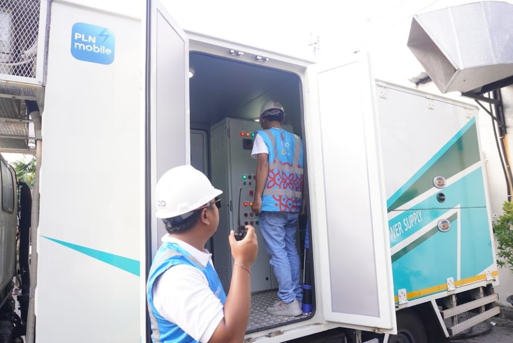 Personil siaga PLN melakukan pengecekan kondisi beban pemakaian listrik di lokasi kegiatan setiap 15 menit sekali pada peralatan pendukung UPS 100 kVA. FOTO DOK PLN
