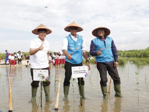 Direktur Utama PLN Darmawan Prasodjo (tengah) bersama jajaran dan Kepala Biro Infrastruktur dan Sumber Daya Alam Sekretariat Daerah Provinsi Jawa Tengah Dadang Somantri saat melakukan penanaman mangrove seluas 10 hektar di kawasan konservasi Pasarbanggi, Rembang, Jawa Tengah. FOTO DOK PLN