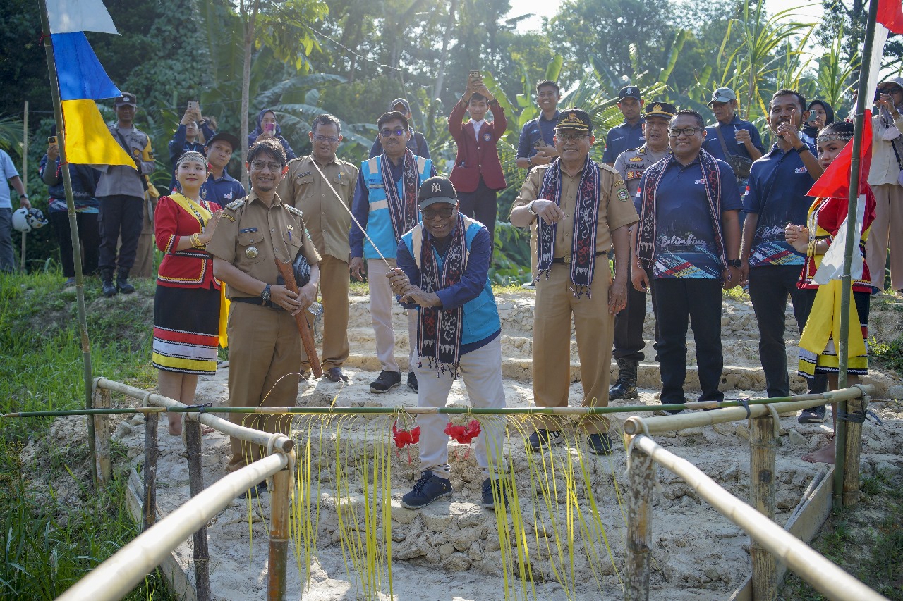 SRM Distribusi UID Kalbar, Salmon Kareth melakukan pemotongan bambu sebagai simbol peresmian penyerahan bantuan Program Tanggung Jawab Sosial dan Lingkungan (TJSL) PLN UID Kalbar di Desa Wisata Batu Belimbing.(FOTO/DOK/PLN)